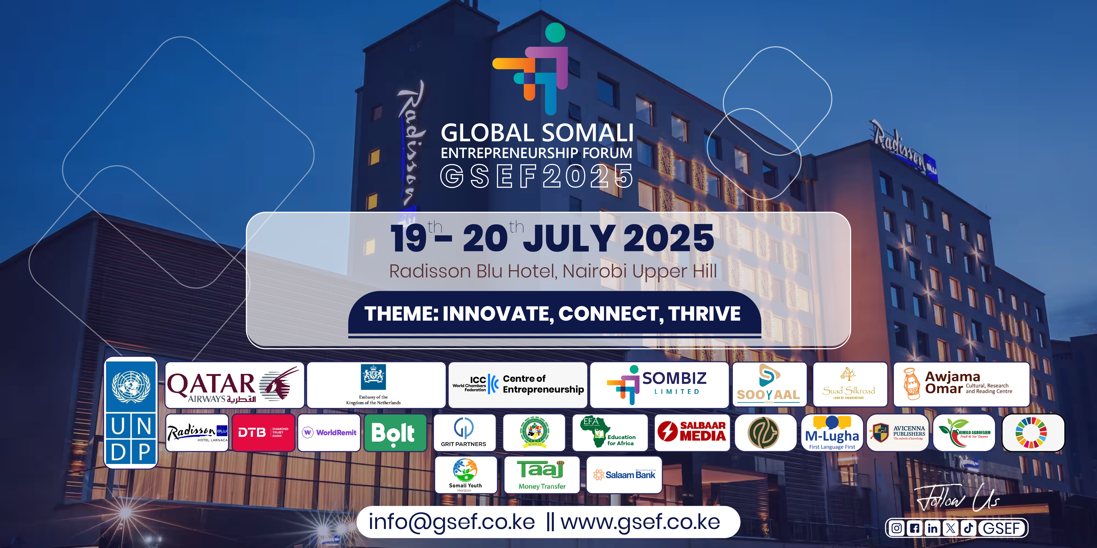The Global Somali Entrepreneurship Forum 2025 is a high-level gathering of Somali entrepreneurs, investors, and leaders, taking place on July 19–20 at Radisson Blu, Nairobi. It aims to spotlight innovation, build networks, and drive investment for Somali-owned businesses globally.